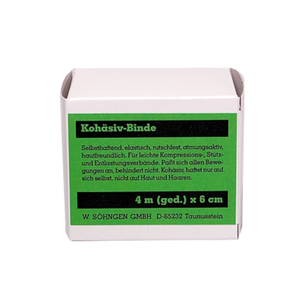 Kohäsiv-Binde. Selbsthaftende, elastische Fixierbinde, passt sich Bewegungen an, behindert nicht. Kompressions-, Stütz- und Entlastungsverbände, Tape-Unterbandage. Kohäsiv, haftet nur auf sich selbst, rutschfest, atmungsaktiv, hautfreundlich.