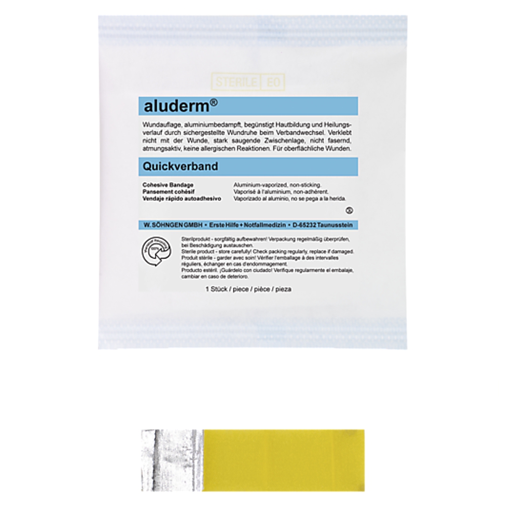 Der absolut unkomplizierte Momentverband, zusätzliche Endfixierung ist nicht erforderlich. Aluminiumbedampfte aluderm Kompresse, auf selbsthaftende Kohäsiv-Binde aufgesiegelt. Einzeln steril in Peelpackung.aluderm - die sanfte Wundtherapie. aluderm mit aluminiumbedampfter Wundauflage ist ideal geeignet für alle oberflächlichen Wunden und Verletzungen, oberflächliche Brandwunden, Schürfwunden, Riss- und Schnittverletzungen. aluderm ist nicht nur ein Markenname, es ist der Inbegriff für perfekte Wundversorgung. Ob kleine Verletzungen oder größere Oberflächenwunden - aluderm bringt immer Erleichterung. Medizinisches Fachpersonal und Patienten sind von aluderm begeistert. Der Erfolg, den aluderm bei der Anwendung auch in Spezialkliniken hat, bestätigt die Außerordentlichkeit und Qualität dieses Verbandstoffes. aluderm ist ein außerordentlich weicher und geschmeidiger Verbandstoff: aluminiumbedampfte Wundauflage aus Polyestervlies, sehr starke Sauglage (Saugfähigkeit 1.400 g/m2) und hydrophobierte PP-Abschlusslage. aluderm hat viele gute Eigenschaften: aluderm verklebt nicht mit der Wunde, fasert nicht, ist stark saugend, atmungsaktiv, hypoallergen, kann bei der Hautbildung und Heilung helfen, physiologisch unbedenklich, ohne optischen Aufheller und frei von chemischen Bindemitteln.