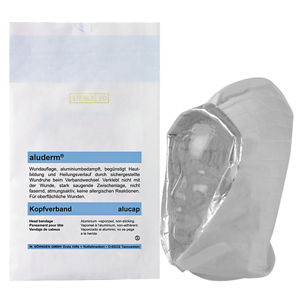 Gebrauchsfertige aluderm Kopfverbandhaube mit innenliegender Aluminiumbedampfung. Schnell, leicht und sicher anzulegen, besonders patientenfreundlich. Mit Klettverschluss unter dem Kinn, problemlose Wundüberwachung, einfacher Verbandwechsel. Einzeln steril in Peelpackung.aluderm - die sanfte Wundtherapie. aluderm mit aluminiumbedampfter Wundauflage ist ideal geeignet für alle oberflächlichen Wunden und Verletzungen, oberflächliche Brandwunden, Schürfwunden, Riss- und Schnittverletzungen. aluderm ist nicht nur ein Markenname, es ist der Inbegriff für perfekte Wundversorgung. Ob kleine Verletzungen oder größere Oberflächenwunden - aluderm bringt immer Erleichterung. Medizinisches Fachpersonal und Patienten sind von aluderm begeistert. Der Erfolg, den aluderm bei der Anwendung auch in Spezialkliniken hat, bestätigt die Außerordentlichkeit und Qualität dieses Verbandstoffes. aluderm ist ein außerordentlich weicher und geschmeidiger Verbandstoff: aluminiumbedampfte Wundauflage aus Polyestervlies, sehr starke Sauglage (Saugfähigkeit 1.400 g/m2) und hydrophobierte PP-Abschlusslage. aluderm hat viele gute Eigenschaften: aluderm verklebt nicht mit der Wunde, fasert nicht, ist stark saugend, atmungsaktiv, hypoallergen, kann bei der Hautbildung und Heilung helfen, physiologisch unbedenklich, ohne optischen Aufheller und frei von chemischen Bindemitteln.