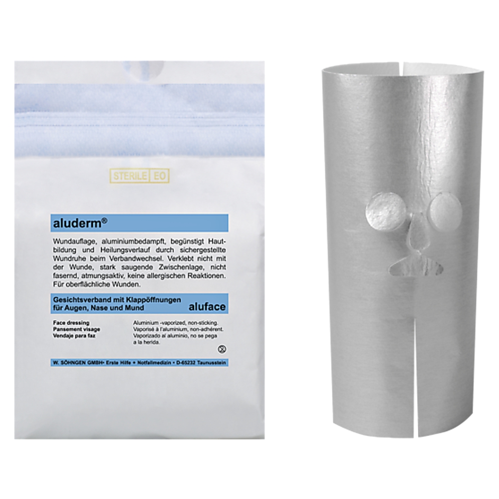 Gebrauchsfertige aluderm Gesichtsmaske zur Abdeckung großflächiger Verletzungen im Gesicht. Mit vorgestanzten Bereichen für Augen, Mund und Nase, das Gesicht wird ganz abgedeckt, die Atemöffnungen bleiben frei. Patientenfreundliche Wundüberwachung und Verbandwechsel, einzeln steril in Peelpackung.aluderm - die sanfte Wundtherapie. aluderm mit aluminiumbedampfter Wundauflage ist ideal geeignet für alle oberflächlichen Wunden und Verletzungen, oberflächliche Brandwunden, Schürfwunden, Riss- und Schnittverletzungen. aluderm ist nicht nur ein Markenname, es ist der Inbegriff für perfekte Wundversorgung. Ob kleine Verletzungen oder größere Oberflächenwunden - aluderm bringt immer Erleichterung. Medizinisches Fachpersonal und Patienten sind von aluderm begeistert. Der Erfolg, den aluderm bei der Anwendung auch in Spezialkliniken hat, bestätigt die Außerordentlichkeit und Qualität dieses Verbandstoffes. aluderm ist ein außerordentlich weicher und geschmeidiger Verbandstoff: aluminiumbedampfte Wundauflage aus Polyestervlies, sehr starke Sauglage (Saugfähigkeit 1.400 g/m2) und hydrophobierte PP-Abschlusslage. aluderm hat viele gute Eigenschaften: aluderm verklebt nicht mit der Wunde, fasert nicht, ist stark saugend, atmungsaktiv, hypoallergen, kann bei der Hautbildung und Heilung helfen, physiologisch unbedenklich, ohne optischen Aufheller und frei von chemischen Bindemitteln.
