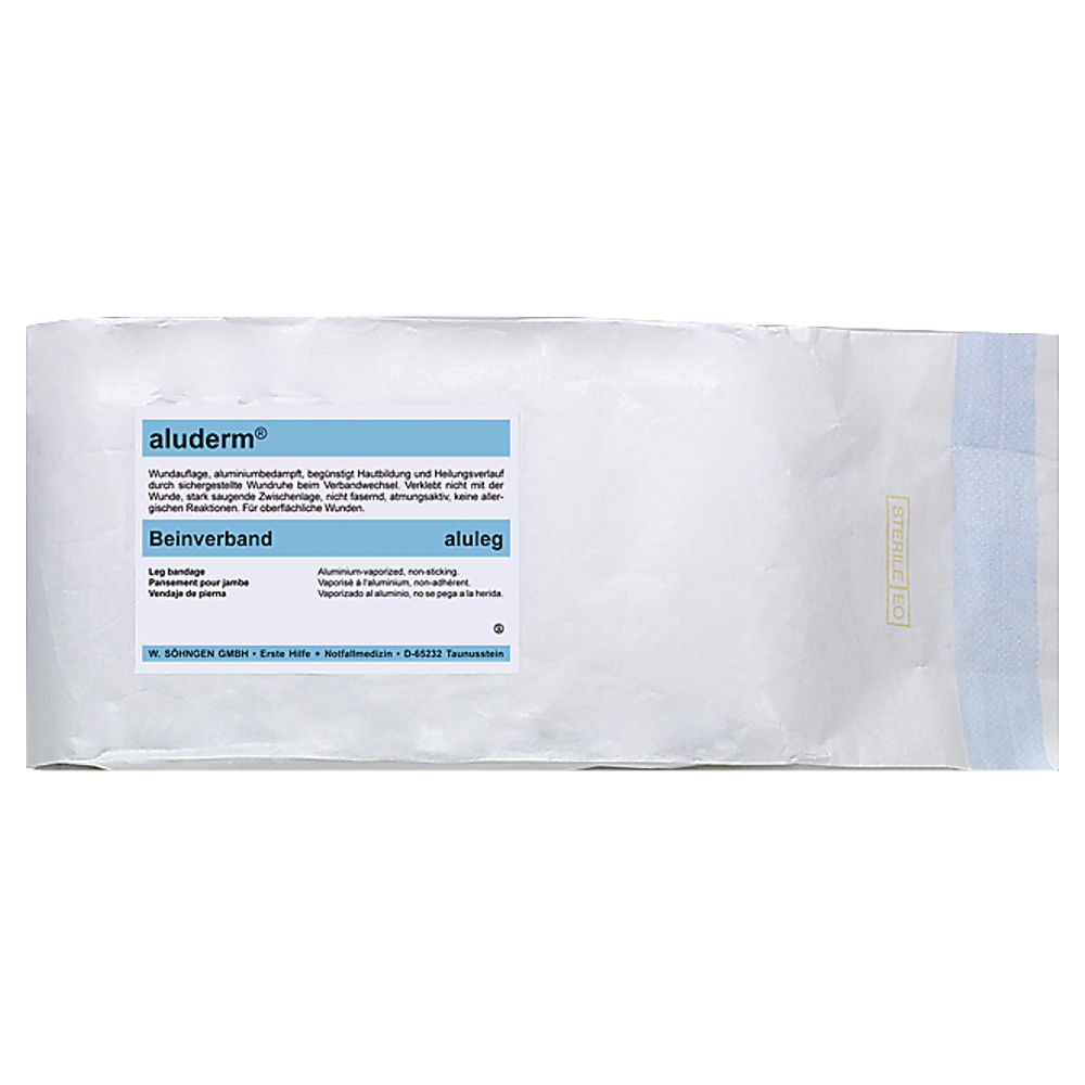 Gebrauchsfertige aluderm Spezialverbände mit Klettband-Schnellfixierung. Die Extremitäten werden dabei ganz umhüllt, der Verband mit den Klettverschlüssen locker fixiert. Patientenfreundliches Handling, problemlose Wundüberwachung, einfacher Verbandwechsel. Einzeln steril in Peelpackung.aluderm - die sanfte Wundtherapie. aluderm mit aluminiumbedampfter Wundauflage ist ideal geeignet für alle oberflächlichen Wunden und Verletzungen, oberflächliche Brandwunden, Schürfwunden, Riss- und Schnittverletzungen. aluderm ist nicht nur ein Markenname, es ist der Inbegriff für perfekte Wundversorgung. Ob kleine Verletzungen oder größere Oberflächenwunden - aluderm bringt immer Erleichterung. Medizinisches Fachpersonal und Patienten sind von aluderm begeistert. Der Erfolg, den aluderm bei der Anwendung auch in Spezialkliniken hat, bestätigt die Außerordentlichkeit und Qualität dieses Verbandstoffes. aluderm ist ein außerordentlich weicher und geschmeidiger Verbandstoff: aluminiumbedampfte Wundauflage aus Polyestervlies, sehr starke Sauglage (Saugfähigkeit 1.400 g/m2) und hydrophobierte PP-Abschlusslage. aluderm hat viele gute Eigenschaften: aluderm verklebt nicht mit der Wunde, fasert nicht, ist stark saugend, atmungsaktiv, hypoallergen, kann bei der Hautbildung und Heilung helfen, physiologisch unbedenklich, ohne optischen Aufheller und frei von chemischen Bindemitteln.
