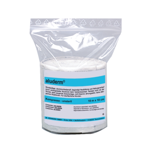 Verbandstoff-Rollenpackungen - unsteril. Verbandstoff am laufenden Meter, zum Abschneiden nach Bedarf. Nachfüllrolle für Spendebox geeignet, in Folienbeutel verpackt.aluderm- die sanfte Wundtherapie. aluderm mit aluminiumbedampfter Wundauflage ist ideal geeignet für alle oberflächlichen Wunden und Verletzungen, oberflächliche Brandwunden, Schürfwunden, Riss- und Schnittverletzungen. aluderm ist nicht nur ein Markenname, es ist der Inbegriff für perfekte Wundversorgung. Ob kleine Verletzungen oder größere Oberflächenwunden - aluderm bringt immer Erleichterung. Medizinisches Fachpersonal und Patienten sind von aluderm begeistert. Der Erfolg, den aluderm bei der Anwendung auch in Spezialkliniken hat, bestätigt die Außerordentlichkeit und Qualität dieses Verbandstoffes. aluderm ist ein außerordentlich weicher und geschmeidiger Verbandstoff: aluminiumbedampfte Wundauflage aus Polyestervlies, sehr starke Sauglage (Saugfähigkeit 1.400 g/m2) und hydrophobierte PP-Abschlusslage. aluderm hat viele gute Eigenschaften: aluderm verklebt nicht mit der Wunde, fasert nicht, ist stark saugend, atmungsaktiv, hypoallergen, kann bei der Hautbildung und Heilung helfen, physiologisch unbedenklich, ohne optischen Aufheller und frei von chemischen Bindemitteln.
