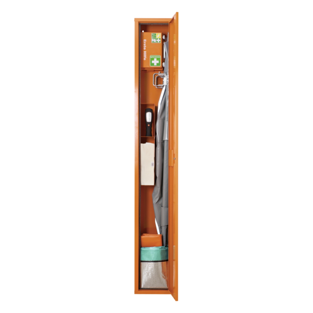 Stehschrank Safe orange gefüllt SÖHNGEN mit Trage und Verbandkasten Norm nach 13157