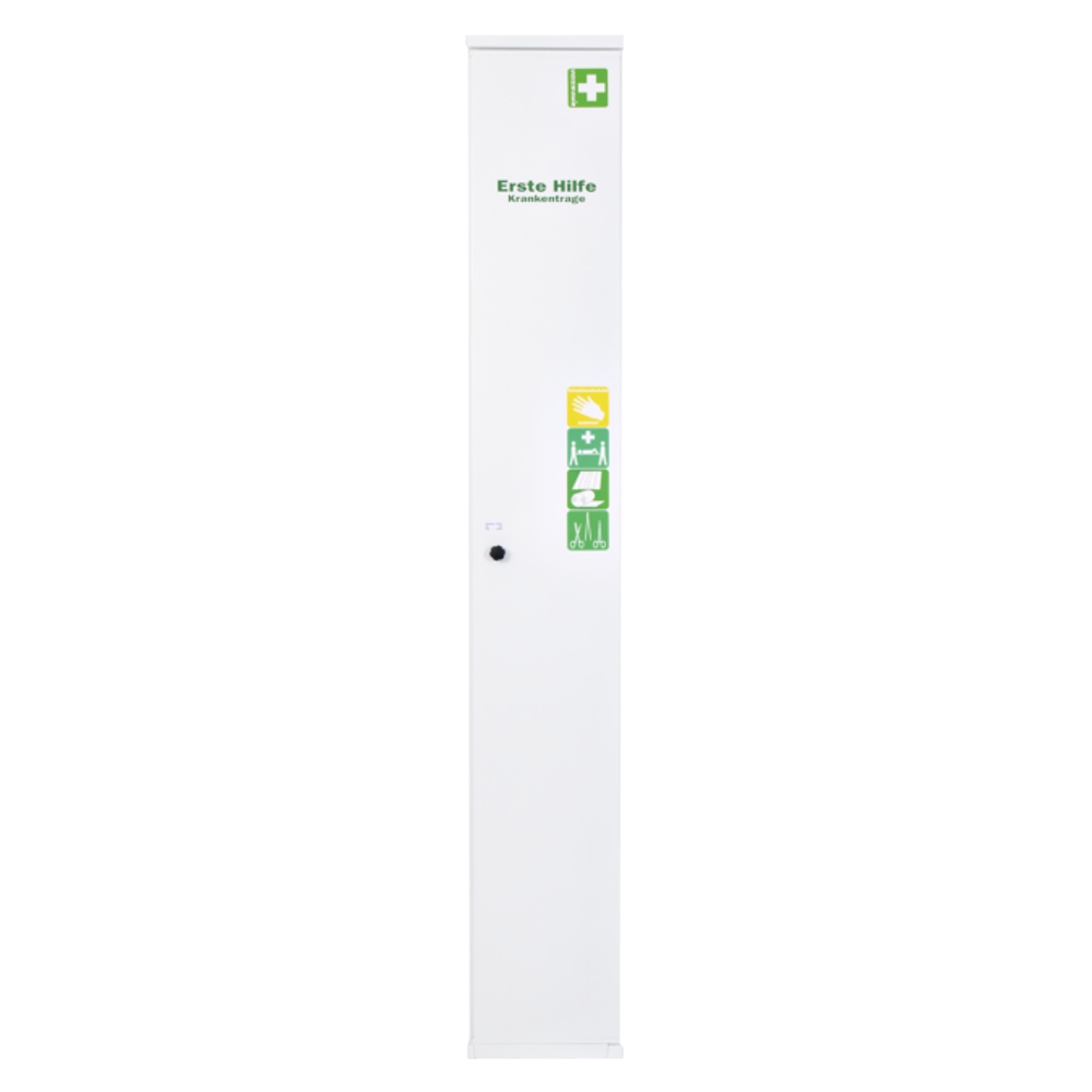 Stehschrank NovoLine 4. für Krankentrage 1 x klappbar. Maße: 2.000 x 300 x 200 mm. NovoLine 4 benötigt wenig Aufstellfläche und ist auch für beengte Platzverhältnisse geeignet. NovoLine ist frei zugängig, der Erste-Hilfe-Inhalt ist kompakt und geschützt untergebracht, im Notfall jedoch sofort verfügbar. Der Inhalt kann in eigenen Fächern in der Tür untergebracht und dadurch schnell und problemlos entnommen werden.