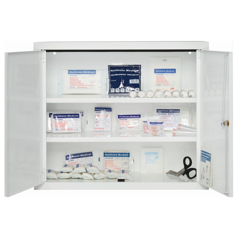 2-türiger Stahlblechschrank mit 3 Innenfächern, 2 davon verstellbar mit umlaufender Gummidichtung als Staubschutz, inklusive Sicherheitsschloss mit 2 Schlüsseln, Gewicht leer: 20 kg, Farbpiktogramm, 60 x 70 x 25 cm, weiß. Zusätzlich mit Füllung DIN 13157 mit Erweiterung.
