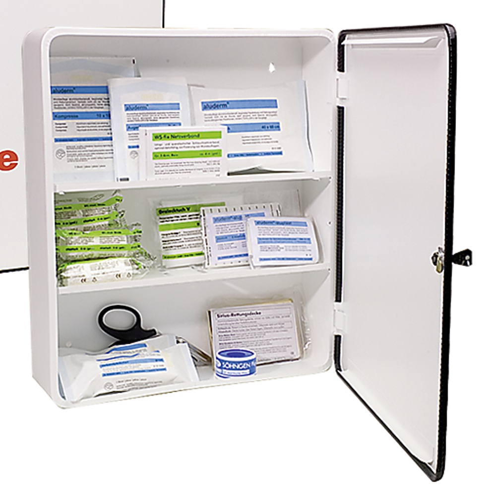 Verbandschrank BONN. 402 x 462 x 112 mm, Stahlblech, weiß, Sicherheitsschloss, zwei Schlüssel. Verbandschrank eintürig, zwei Einlegeböden. Kann durch ein Medikamentenfach, einen zusätzlichen Einlegeboden und bis zu vier Schubladen erweitert werden. Hochwertige Füllung nach DIN 13157.