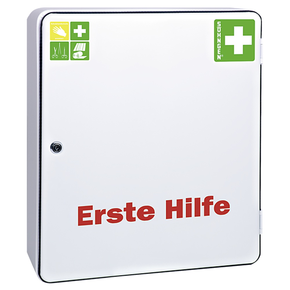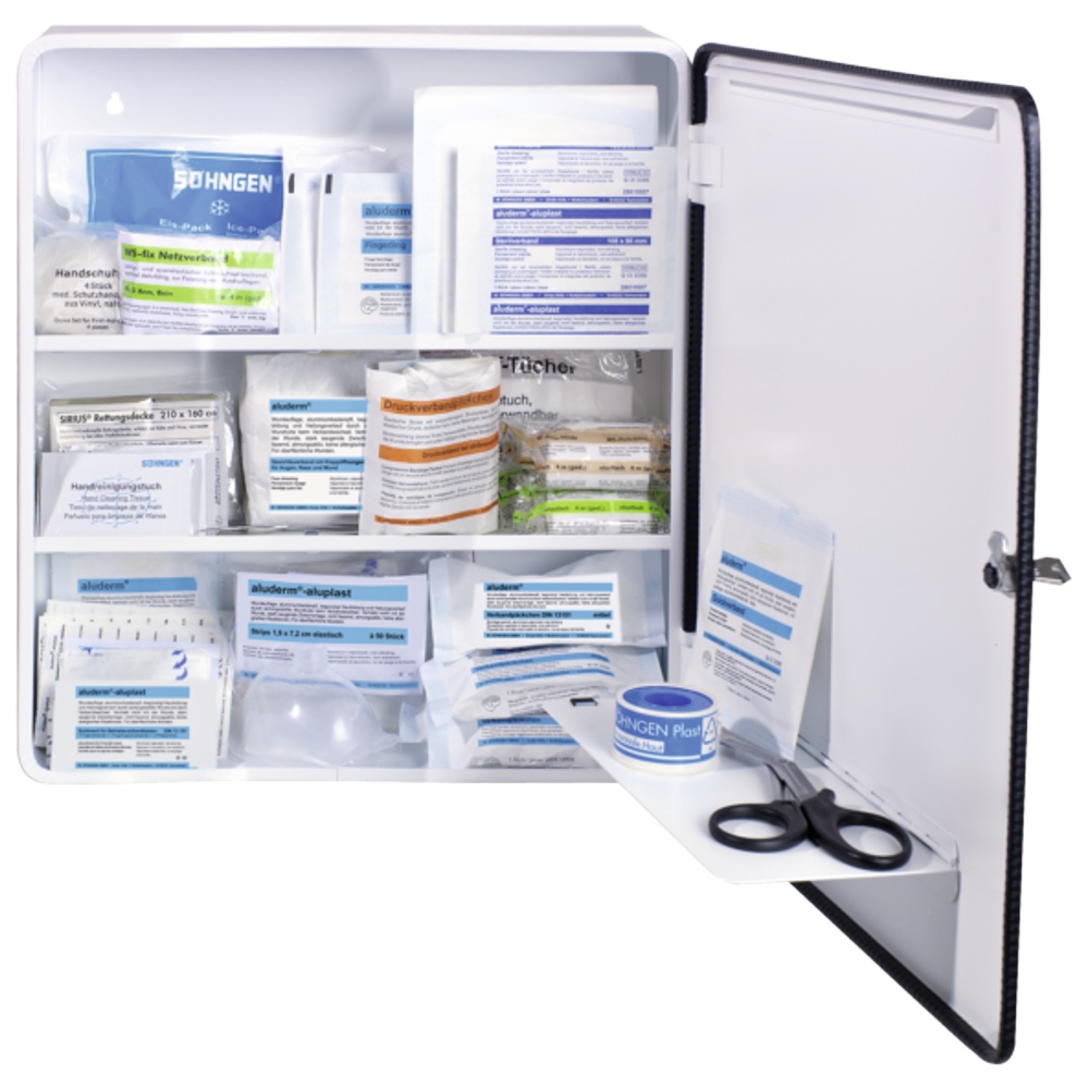 Verbandschrank BONN. 402 x 462 x 112 mm, Stahlblech, weiß, Sicherheitsschloss, zwei Schlüssel. Verbandschrank eintürig, zwei Einlegeböden. Kann durch ein Medikamentenfach, einen zusätzlichen Einlegeboden und bis zu vier Schubladen erweitert werden. Hochwertige Füllung nach DIN 13157 einschließlich Erweiterungsset Plus 147 Teile mit SÖHNGEN-Markenverbandstoffen.