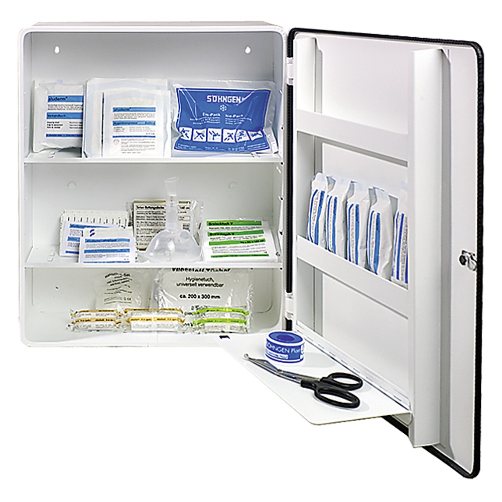 Verbandschrank DRESDEN. 452 x 552 x 170 mm, Stahlblech, weiß, Sicherheitsschloss, zwei Schlüssel. Verbandschrank eintürig, zwei Einlegeböden, Tür mit drei Ablageschalen. Die Inneneinrichtung kann durch ein Medikamentenfach, einen zusätzlichen Einlegeboden und bis zu sechs Schubladen erweitert werden. Hochwertige Füllung nach DIN 13157.