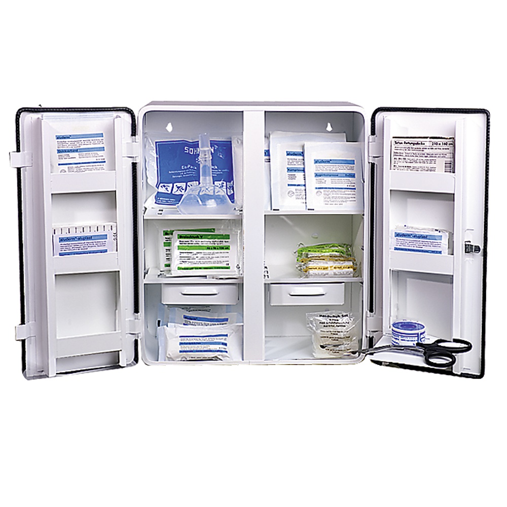 Verbandschrank HAMBURG. 404 x 462 x 170 mm, Stahlblech, weiß, Sicherheitsschloss, zwei Schlüssel. Verbandschrank zweitürig, zwei Einlegeböden, zwei Schubladen, Türen mit je drei Ablageschalen. Die Inneneinrichtung kann durch ein Medikamentenfach, einen zusätzlichen Einlegeboden und bis zu vier Schubladen erweitert werden.Hochwertige Füllung nach DIN 13157.