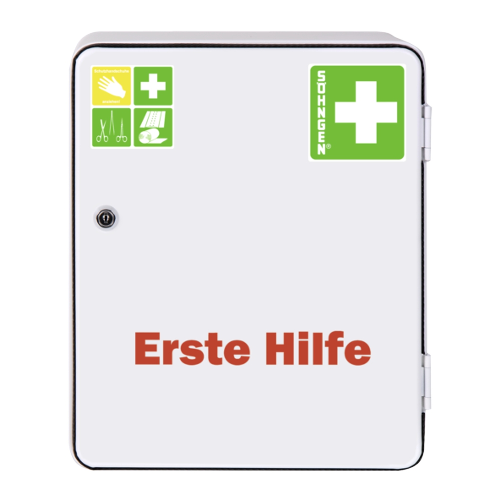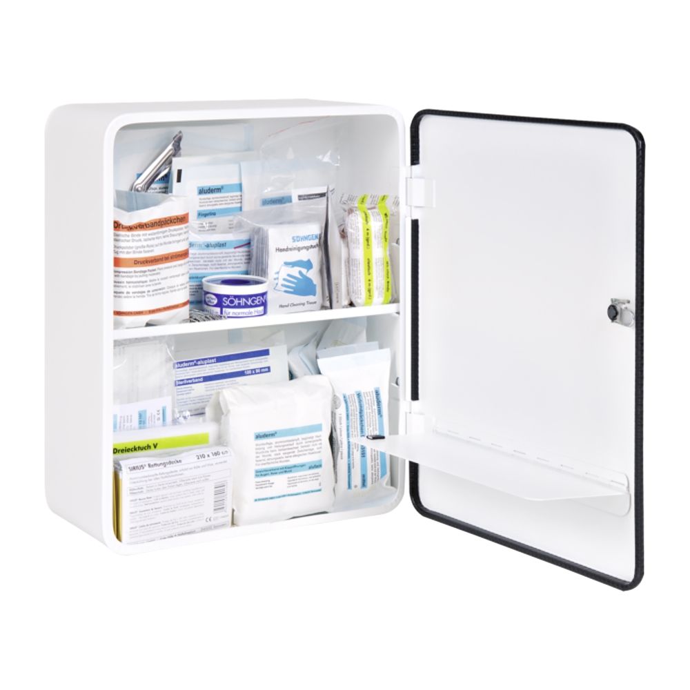 Verbandschrank HEIDELBERG. 302 x 362 x 140 mm, Stahlblech, weiß, Sicherheitsschloss, zwei Schlüssel. Verbandschrank eintürig, ein Einlegeboden. Die Inneneinrichtung kann durch ein Medikamentenfach, einen zusätzlichen Einlegeboden und bis zu zwei Schubladen erweitert werden. Hochwertige Füllung nach DIN 13157 einschließlich Erweiterungsset Plus 147 Teile mit SÖHNGEN-Markenverbandstoffen.