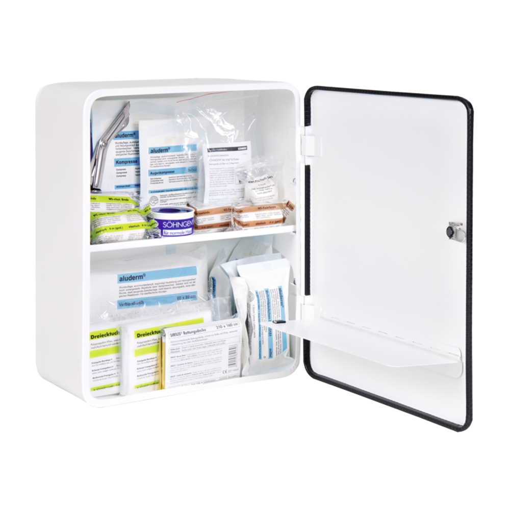 Verbandschrank HEIDELBERG. 302 x 362 x 140 mm, Stahlblech, weiß, Sicherheitsschloss, zwei Schlüssel. Verbandschrank eintürig, ein Einlegeboden. Die Inneneinrichtung kann durch ein Medikamentenfach, einen zusätzlichen Einlegeboden und bis zu zwei Schubladen erweitert werden. Hochwertige Füllung nach DIN 13157.