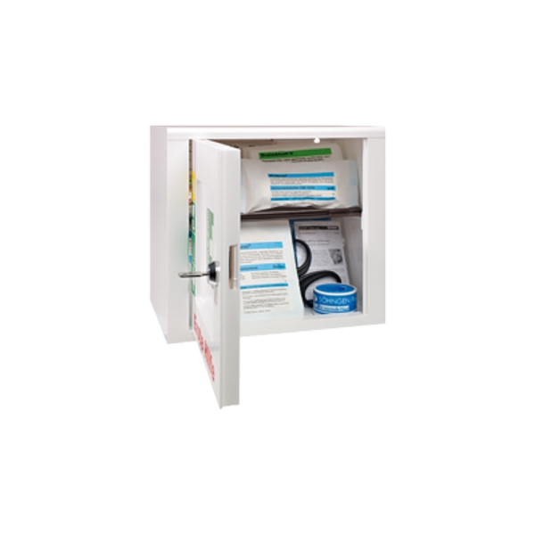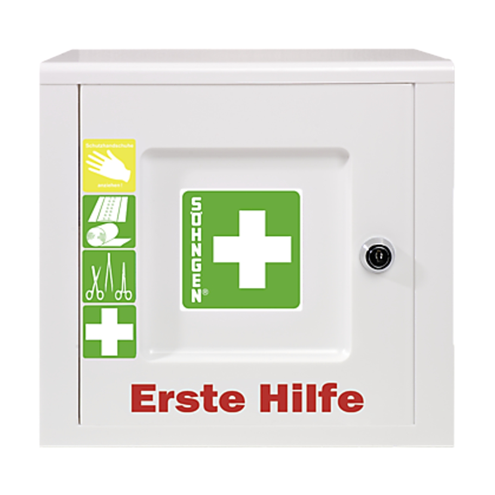 Verbandschrank PICCOLO. 265 x 245 x 180 mm, Kunststoff, verschließbar, weiß, eintürig, ein Fachboden. Hochwertige Füllung nach DIN 13157.
