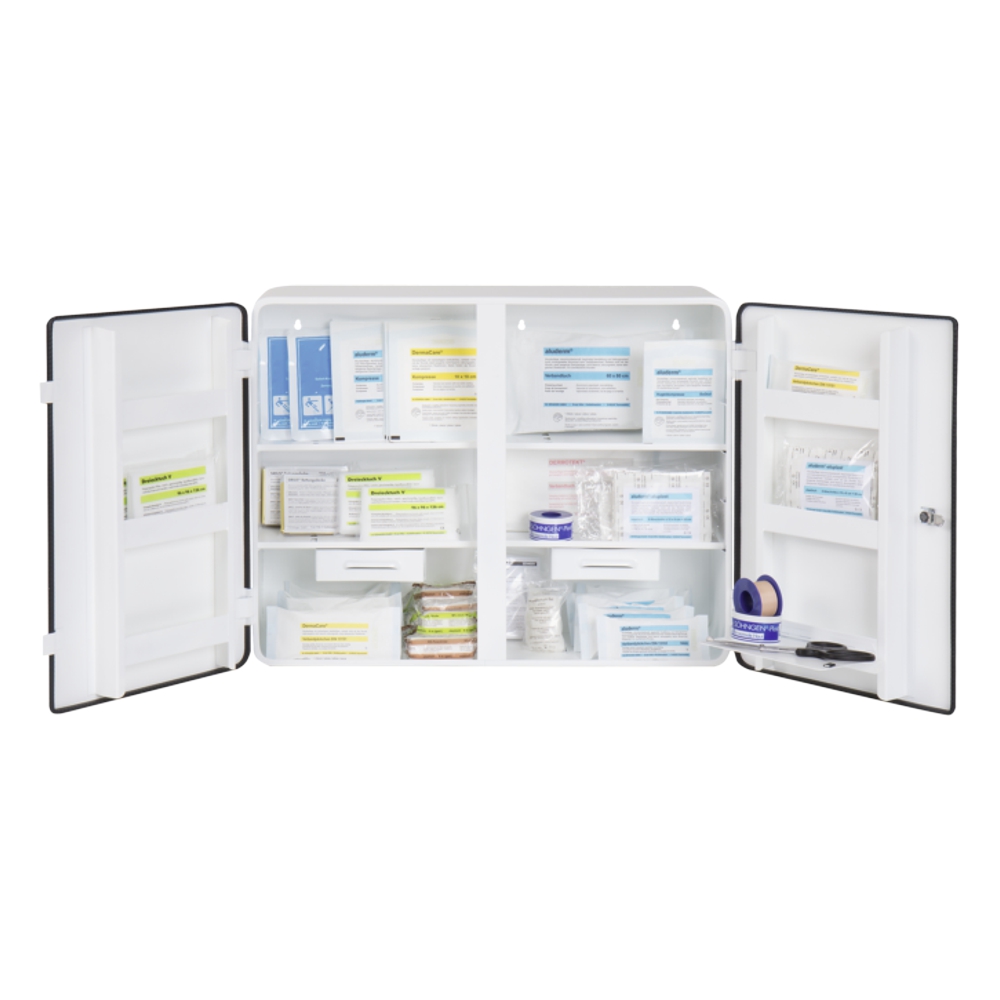 - Verbandschrank zweitürig, verschließbar, vier Einlegeböden, zwei Schubladen, Türen mit je drei Ablageschalen