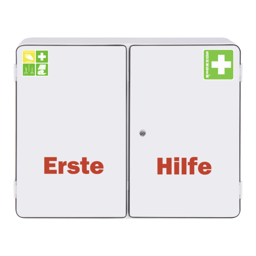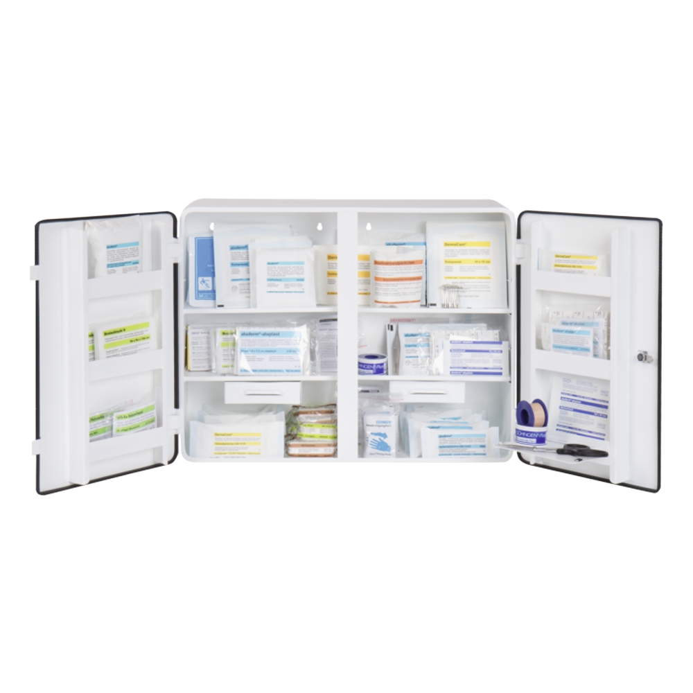 - Verbandschrank zweitürig, verschließbar, vier Einlegeböden, zwei Schubladen, Türen mit je drei Ablageschalen