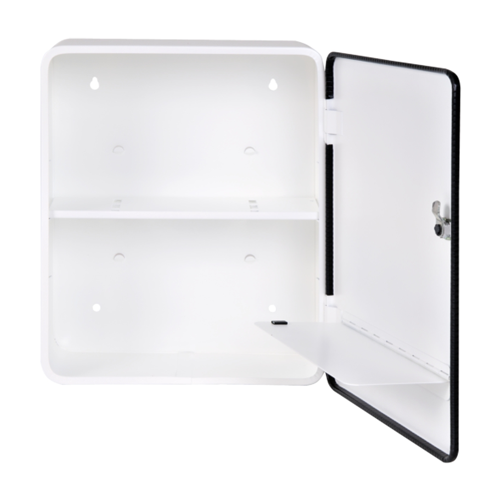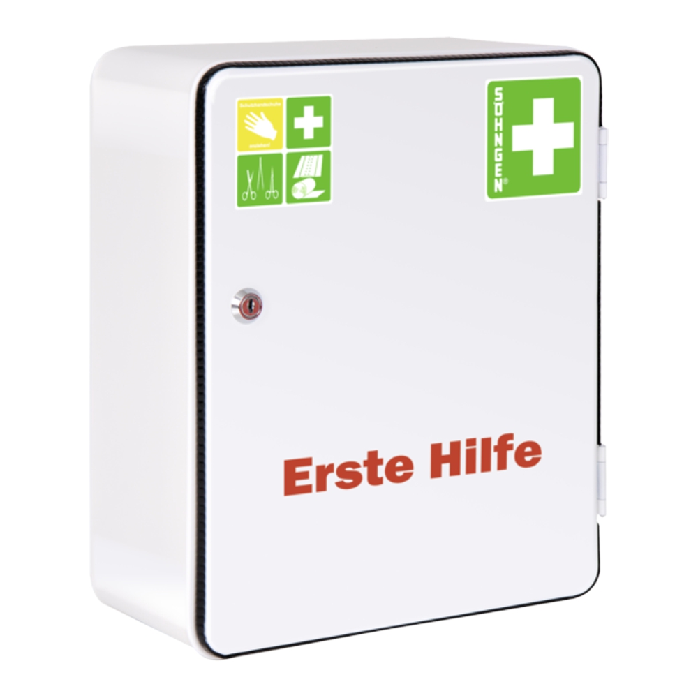 Verbandschrank HEIDELBERG. 302 x 362 x 140 mm, Stahlblech, weiß, Sicherheitsschloss, zwei Schlüssel. Verbandschrank eintürig, ein Einlegeboden. Zusätzlich klappbares Ablagetableau zur hygienischen Zwischenlagerung von Verbandmaterial bei der Erste-Hilfe-Leistung. Die Inneneinrichtung kann durch ein Medikamentenfach, einen zusätzlichen Einlegeboden und bis zu zwei Schubladen erweitert werden.