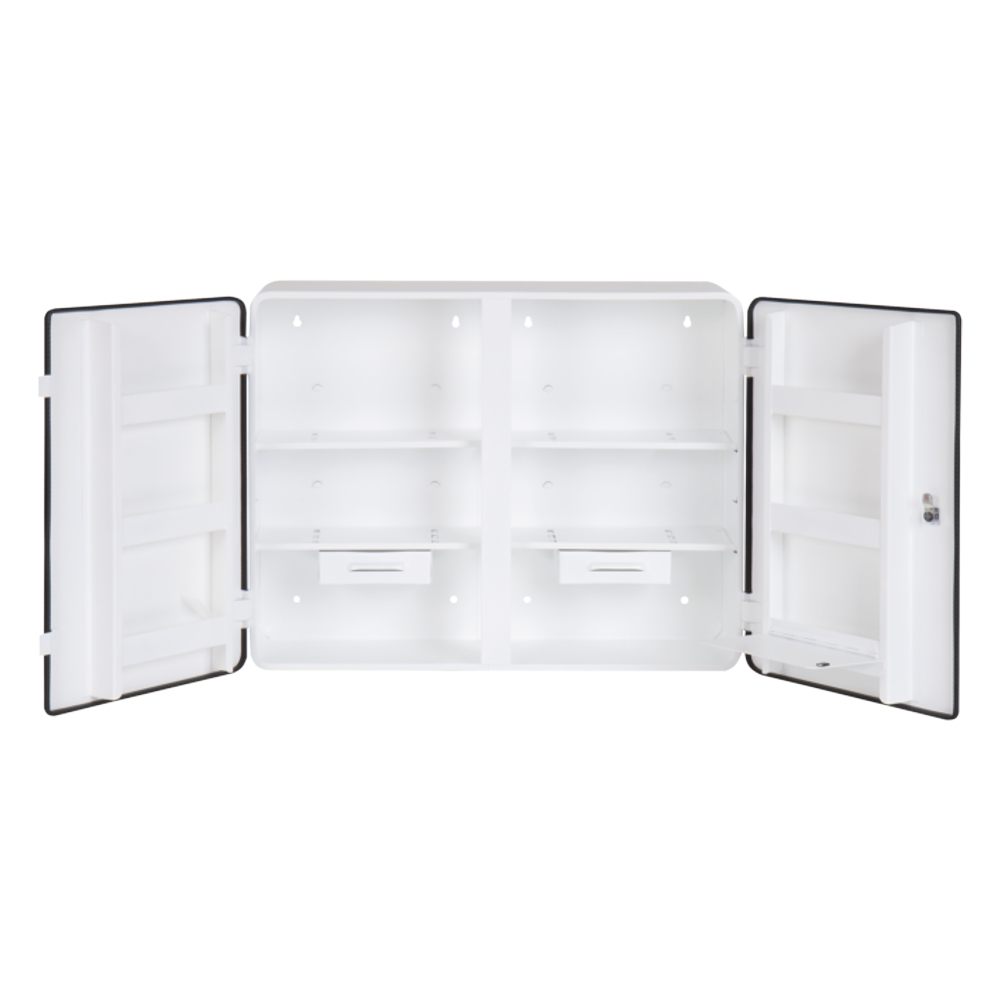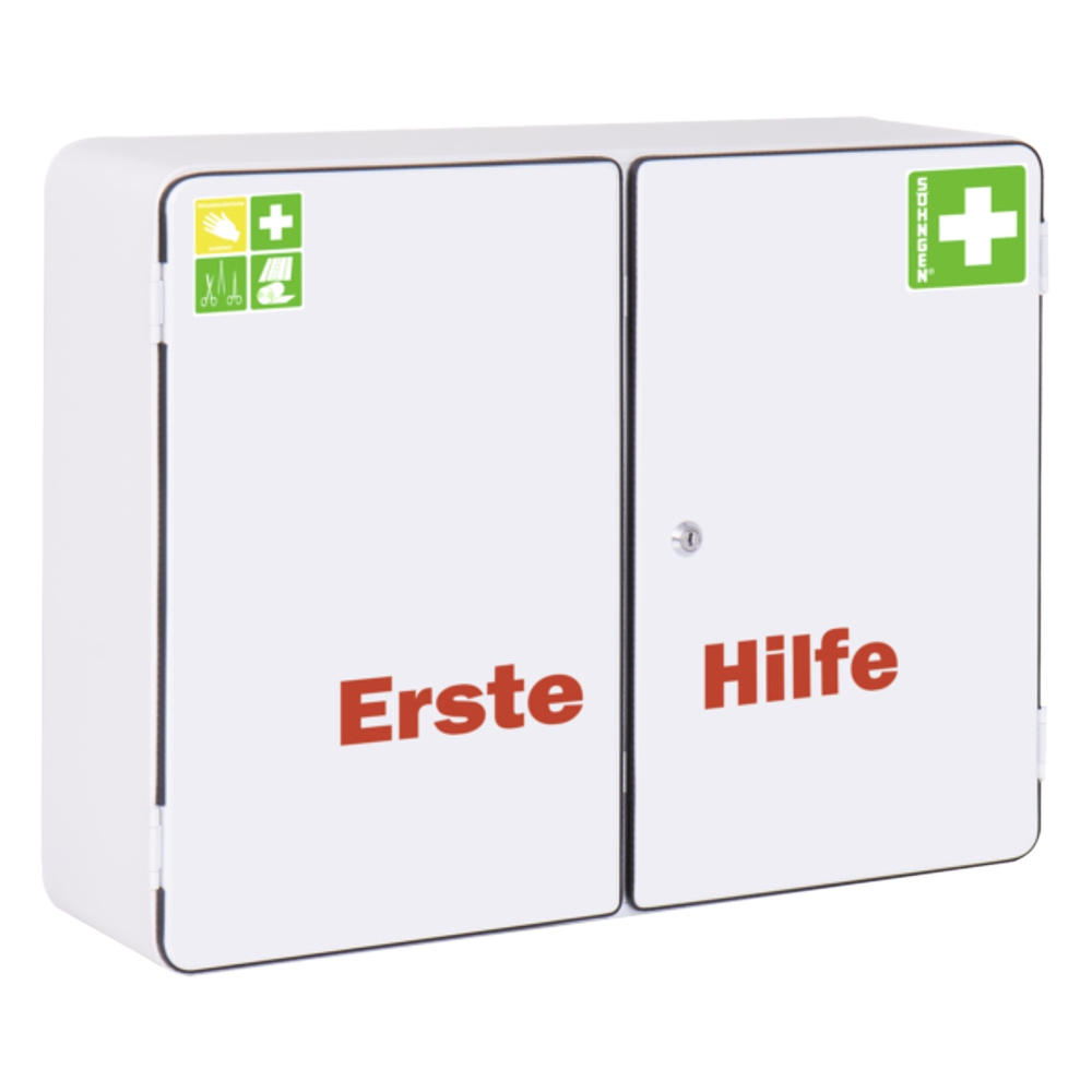 Mit Sicherheitsschloss, zwei Schlüssel. Verbandschrank zweitürig, verschließbar, vier Einlegeböden, zwei Schubladen, Türen mit je drei Ablageschalen. Kann durch ein Medikamentenfach, zwei zusätzliche Einlegeböden und bis zu vier Schubladen erweitert werden. Zusätzlich klappbares Ablagetableau zur hygienischen Zwischenlagerung von Verbandmaterial bei der Erste-Hilfe-Leistung. Maße: 604 x 462 x 170 mm. Material: Stahlblech, weiß.