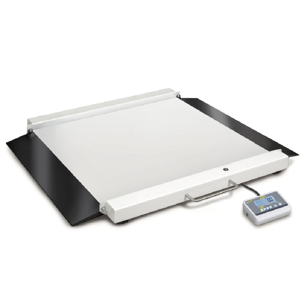 Rollstuhlwaage mit zwei integrierten Auffahrrampen für bequemes Auffahren – mit Eich- und Medizinzulassung für den professionellen Einsatz in der medizinischen Diagnostik.
